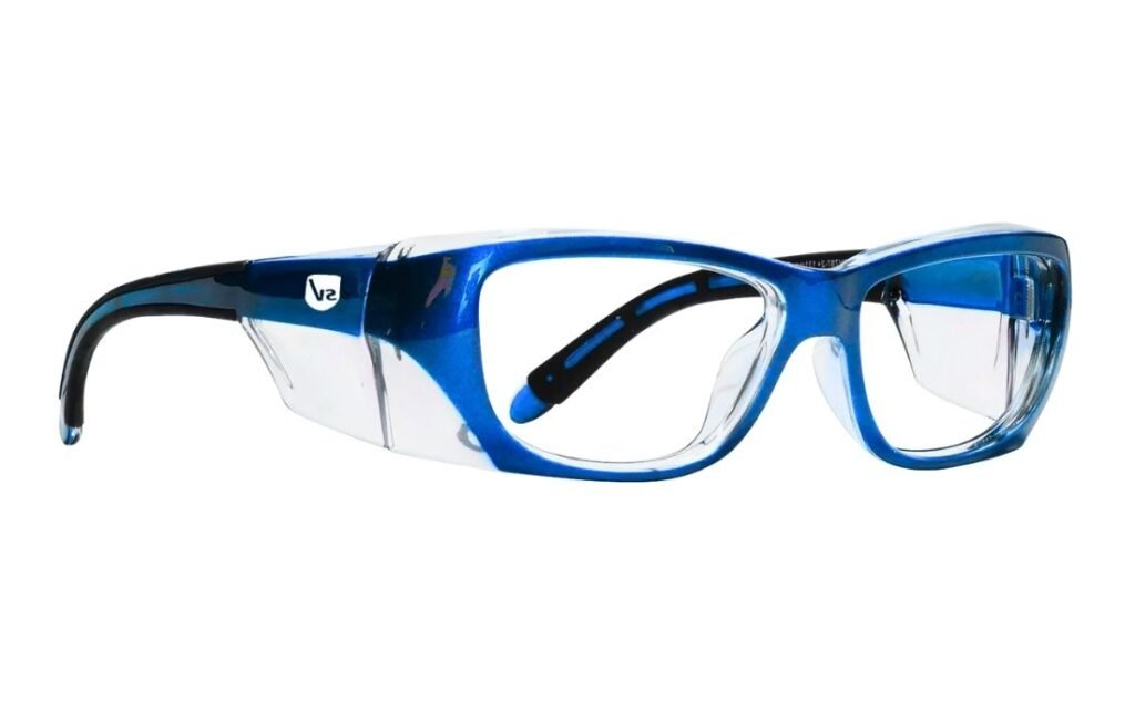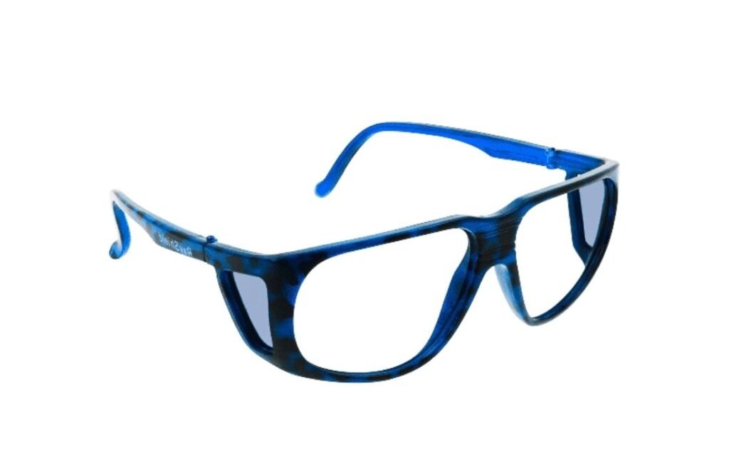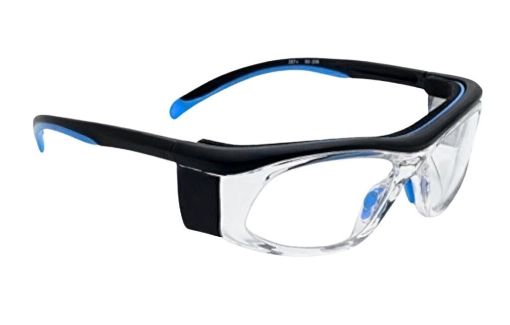 Modern transparent frame accented with blue highlights, crafted from special protective materials that provide both style and effective lateral radiation shielding.